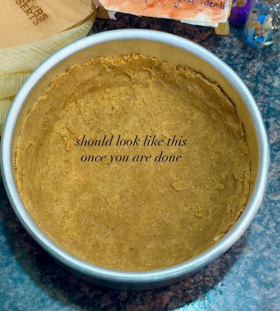Transfer this into the cheesecake pan and tap it down to form a nice biscuit base and let it chill while you make the cheesecake filling.