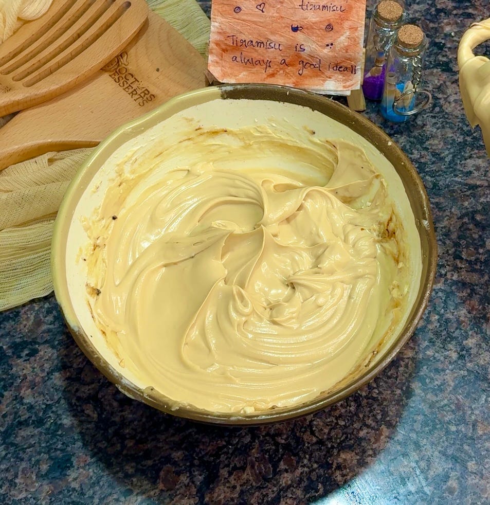 In another bowl, add the rest of the ingredients (mascarpone, cream cheese, powdered sugar, vanilla, instant coffee) and whisk until soft and well combined.